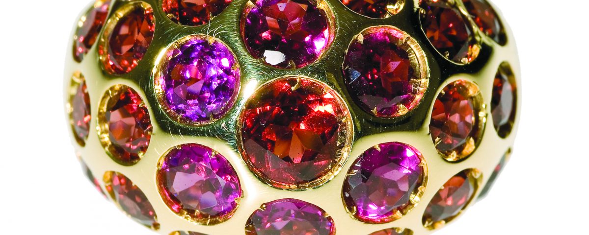 Een 18 karaat geel gouden ring, bezet met 25 roze Saffieren. De Saffieren variëren in grootte en kleurnuance. Het totaal gewicht aan Saffier is circa 1.65 ct. Deze ring is 12 mm breed, Is gemaakt door een Italiaanse designer uit de collectie van Bigli uit 2003. Deze ring is Nederlands herkeurd. De ringmaat is 17,5. Het brutogewicht is 10.2 gram.